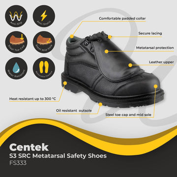 - Metatarsal safety shoes are similar to composite and steel toe options, but also include a protective plate that covers the metatarsal part of the foot. They offer protection to the upper area of the foot between the bottom of the shin and toes