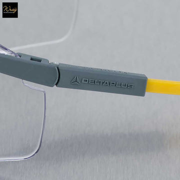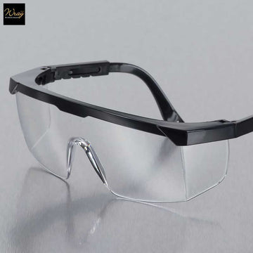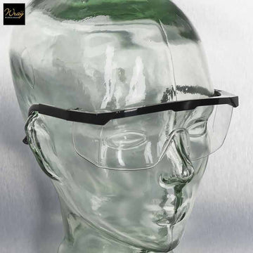 Stylish work glasses with a clear wrap-around lens with side shield temple and rubber ends...