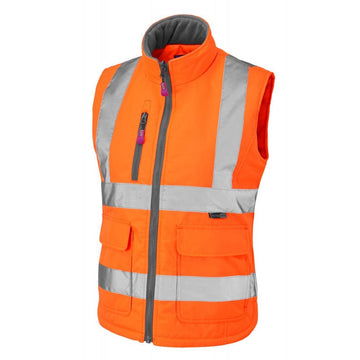 Leo Workwear Women's Hi Vis Bodywarmer designed with convenient storage. This women's Sandymere Hi-Vis bodywarmer...