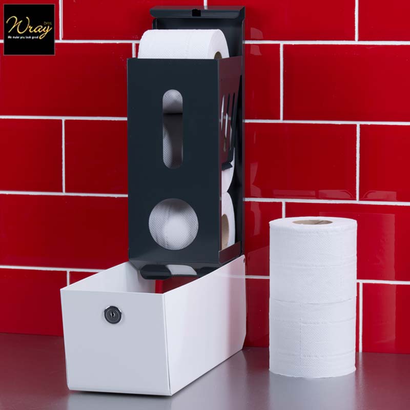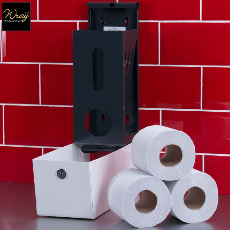 A lockable, sturdy, durable metal dispenser enabling storage of up to three standard toilet rolls.