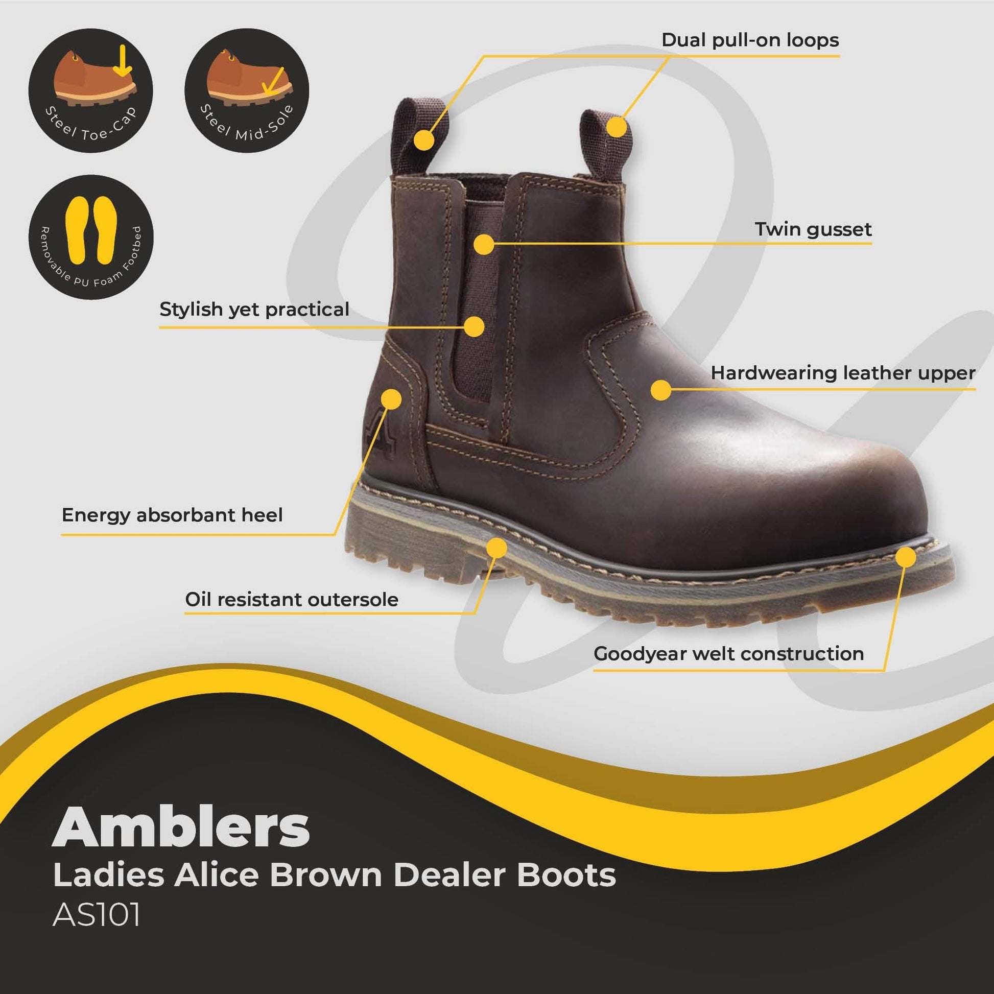 A versatile, modern Goodyear Welt safety dealer boot crafted with brown Crazy Horse leather, which boasts a steel toecap and midsole, pull on loops for quick, easy access, along with twin elastic gussets, a Nitrile Rubber outsole with energy absorbing heel for comfort.