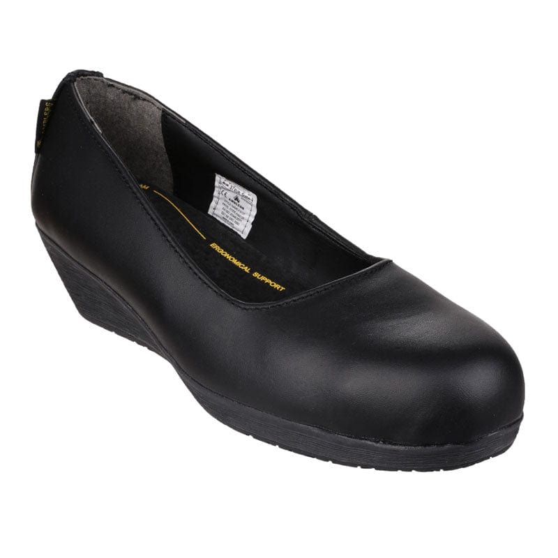 Black wedged heel leather ladies shoe with steel toe cap and offers excellent anti-slip SRC sole. 200J toe protection.