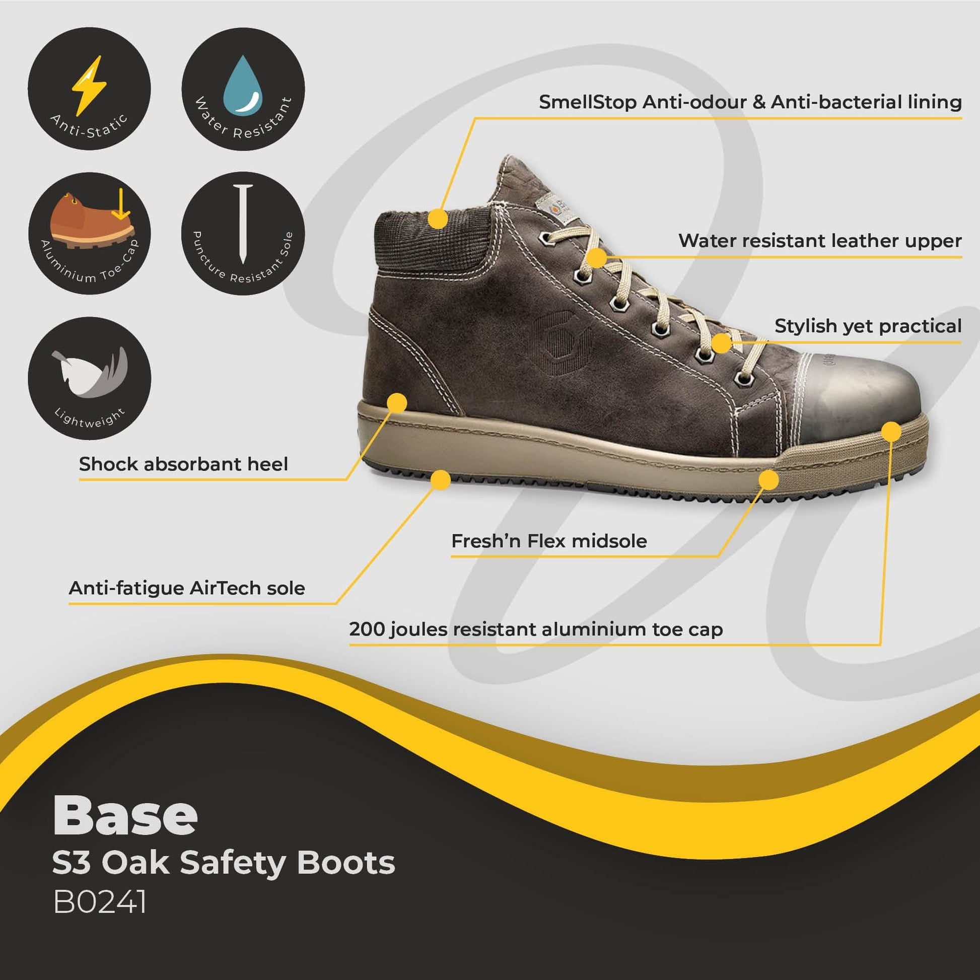 Boasting SmellStop antibacterial lining, which prevents bacteria and fungus responsible for odours, from taking hold - meaning your feet and footwear stays fresher for longer. This Base Oak safety boot is also made from a full-grain leather making the upper water resistant to the outside elements.
