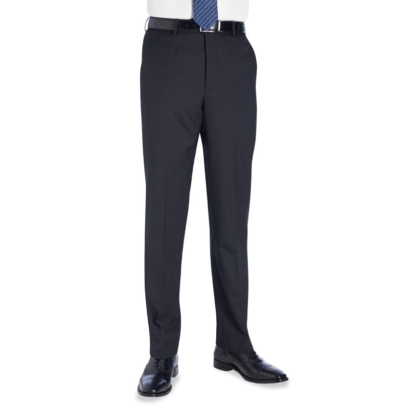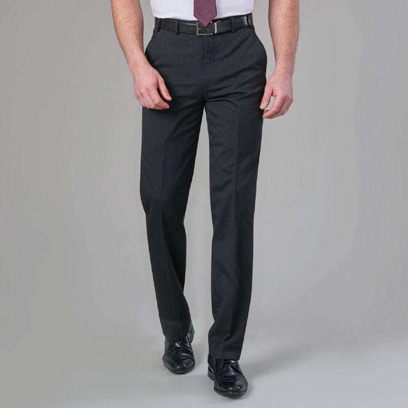 Men's flat front tailored fit trouser in black, made from recycled polyester and featuring 2 side pockets and 1 rear pocket. Also available in Navy, Charcoal and Mid Grey.