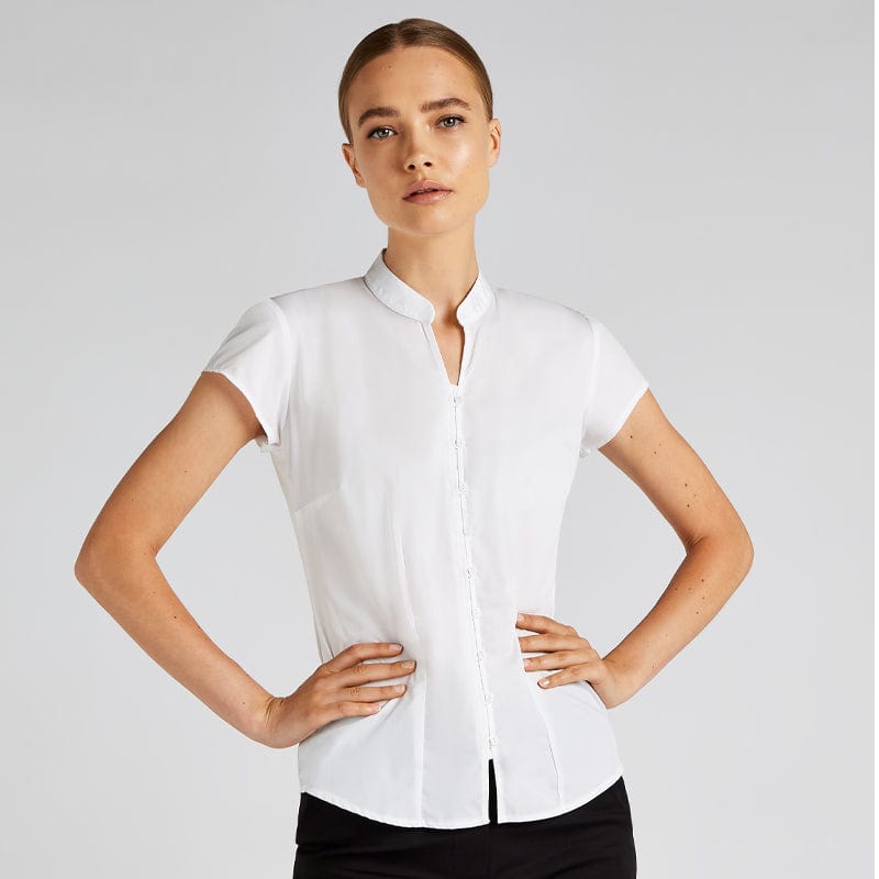 Designed with elegant cap sleeves, this blouse offers something different in attire with a delicate yet stylish corporate image.
