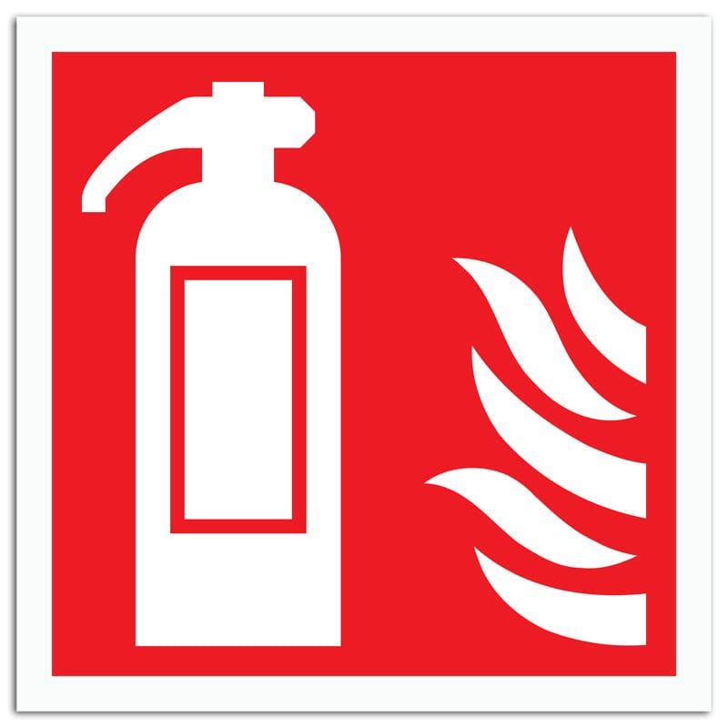 Fire Equipment Signs: Fire Extinguisher with Flames Sign to help staff react appropriately in the event of a fire. Available in two sizes 100 x 100mm and 200 x 200mm.