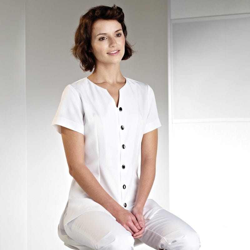 Florentine button fasten spa tunic made from a polyester stretch fabric, in a popular unique style.