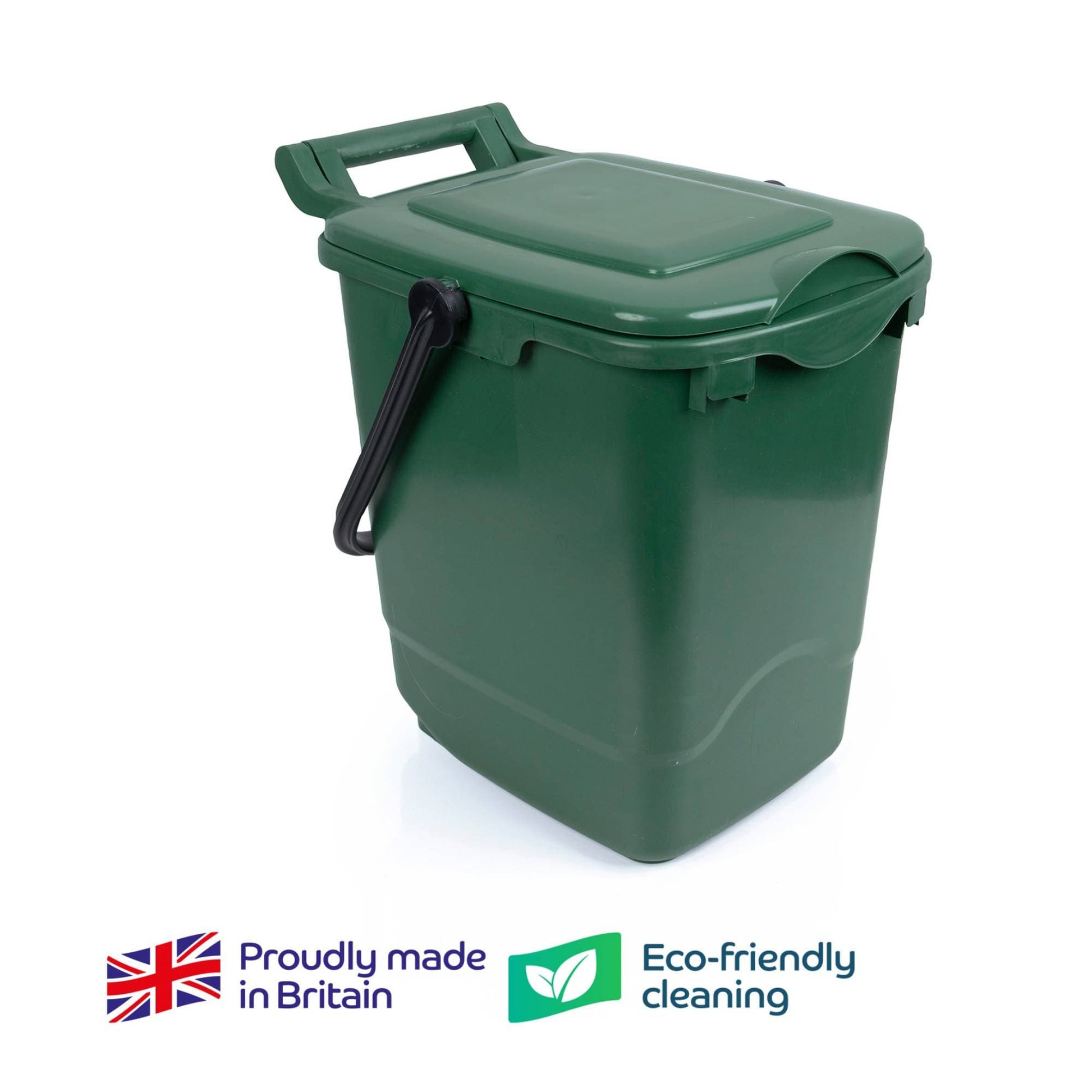 UK-manufactured solution for efficient food waste recycling. Features a lockable handle and wide aperture for easy disposal. Constructed from 100% recycled and recyclable plastic, this robust caddy ensures secure waste containment.
