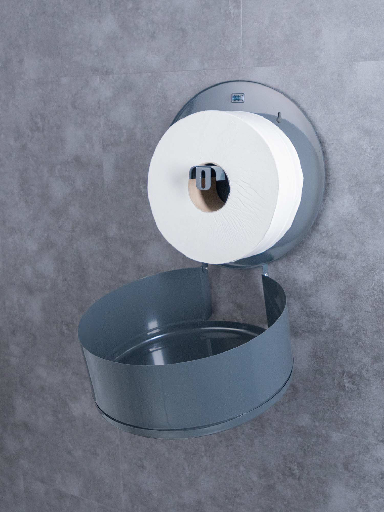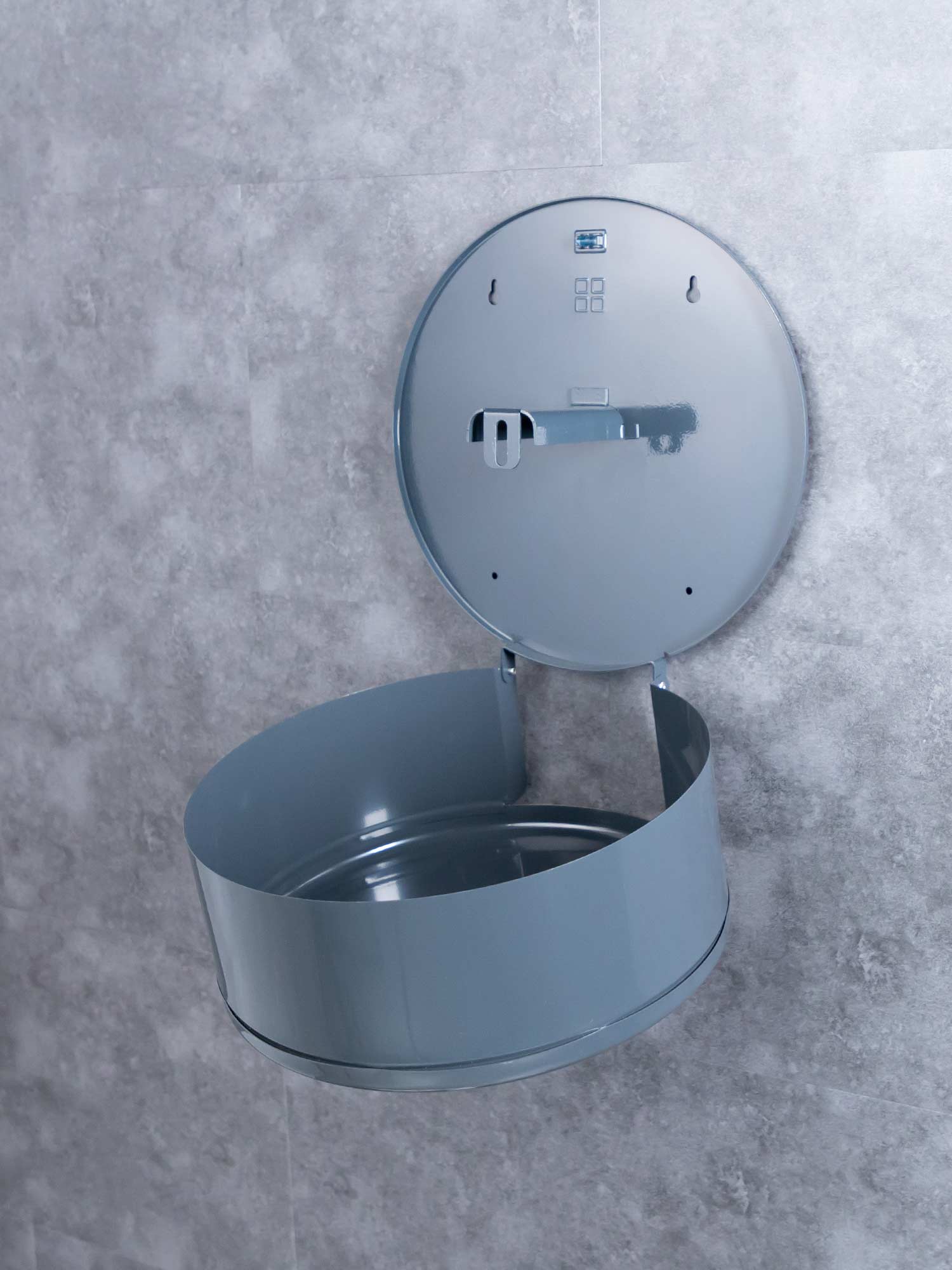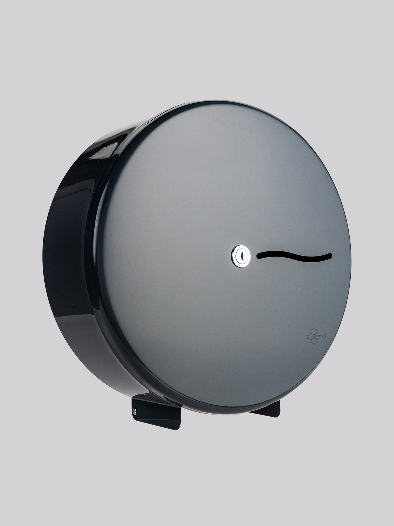 This is a key lockable and hinged dispenser with a large capacity for up to 320mm rolls. It includes a level indicator for easy monitoring and can accommodate both 2¼-inch and 3-inch rolls.