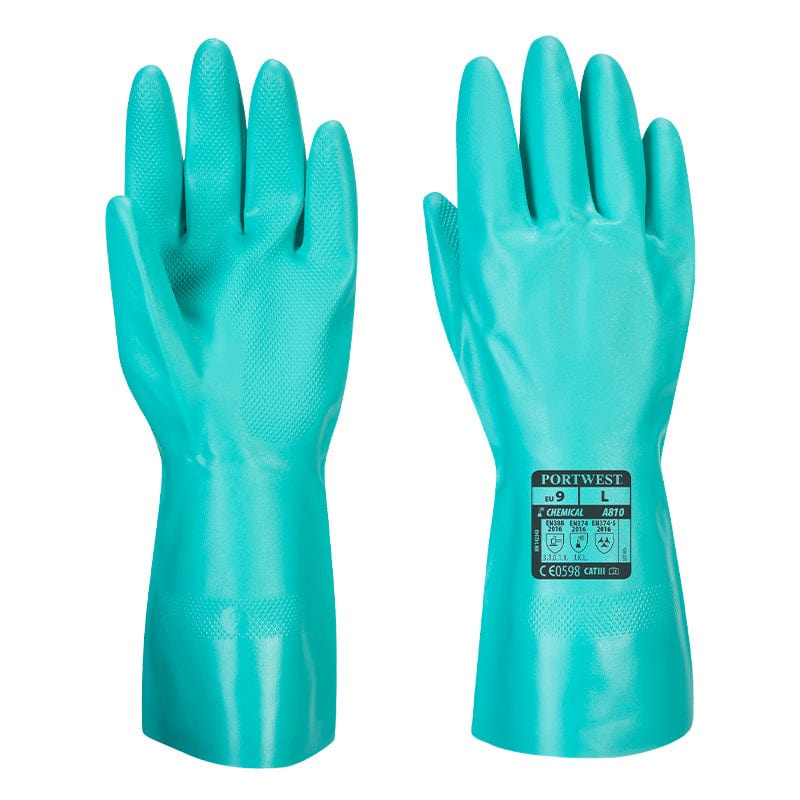 The Portwest Green Nitrile Gauntlet Glove A810 is a chemical resistant gauntlet with textured pattern for enhanced grip and flocklined for added comfort. For use in a number of industries that manage chemicals, oils or food etc. The gauntlet glove is lightweight and features a textured palm and fingertips for precision handling of chemicals.