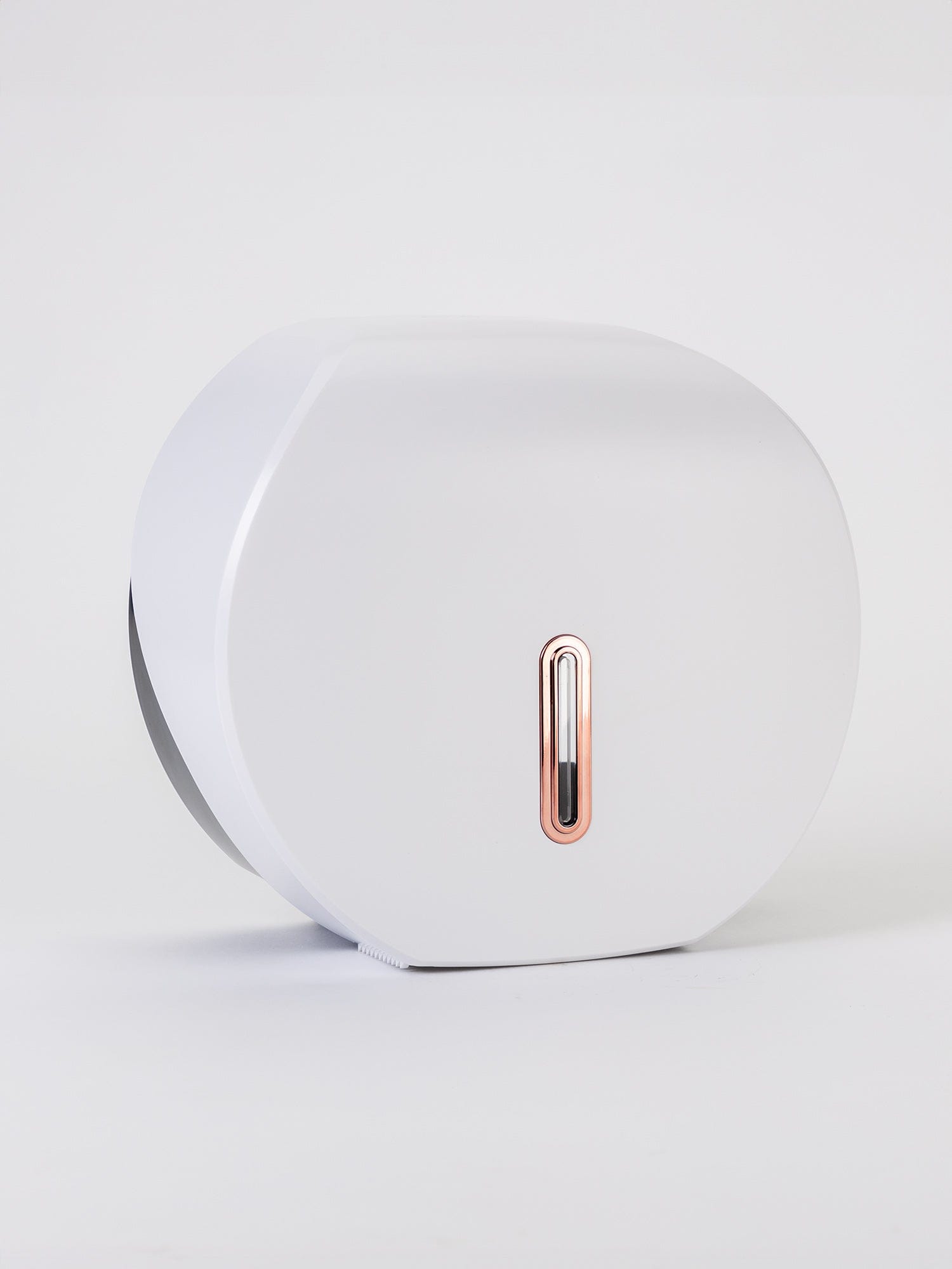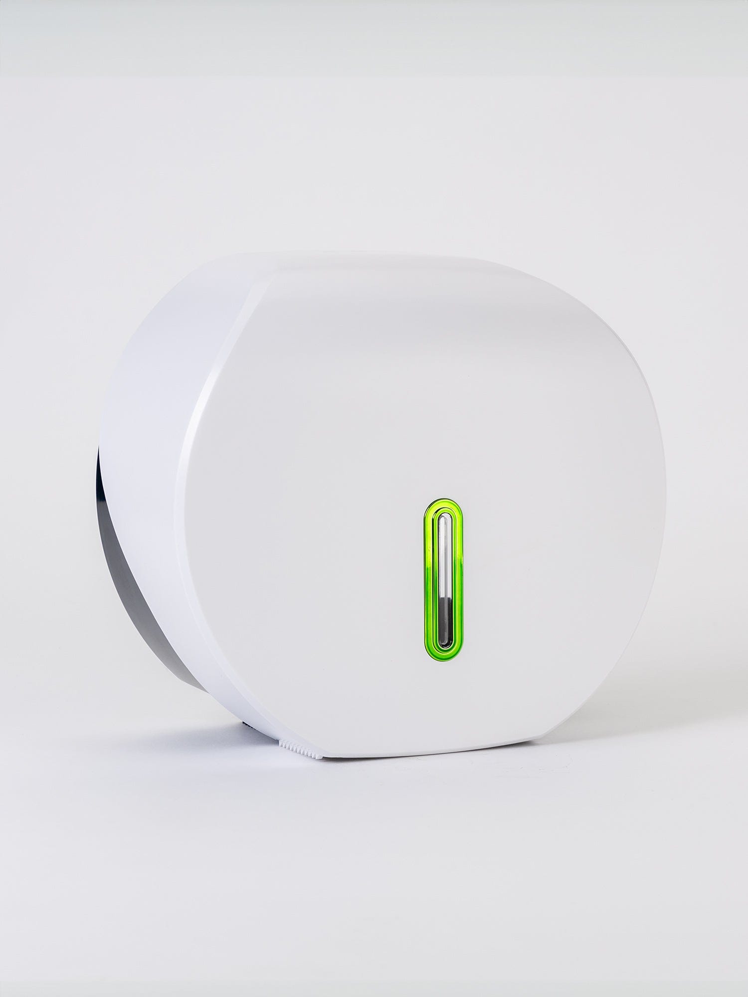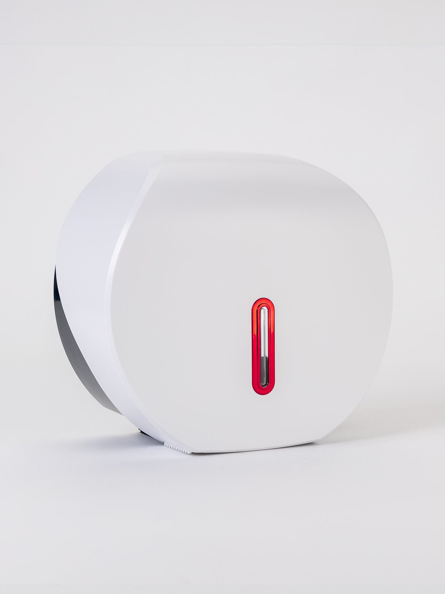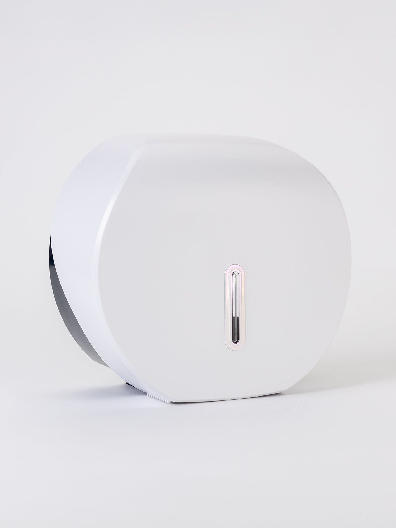 Its ABS plastic construction with a contemporary "silk touch" Satin White/Graphite finish is both sturdy and stylish. With a premium build and appearance, the unit is able to hold 1 x 8” mini jumbo roll, which it dispenses freely and consistently when pulled.