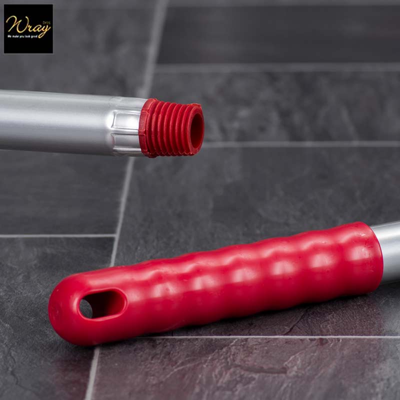 An aluminium handle with coloured grip and thread that has a built-in loop for easy hanging.