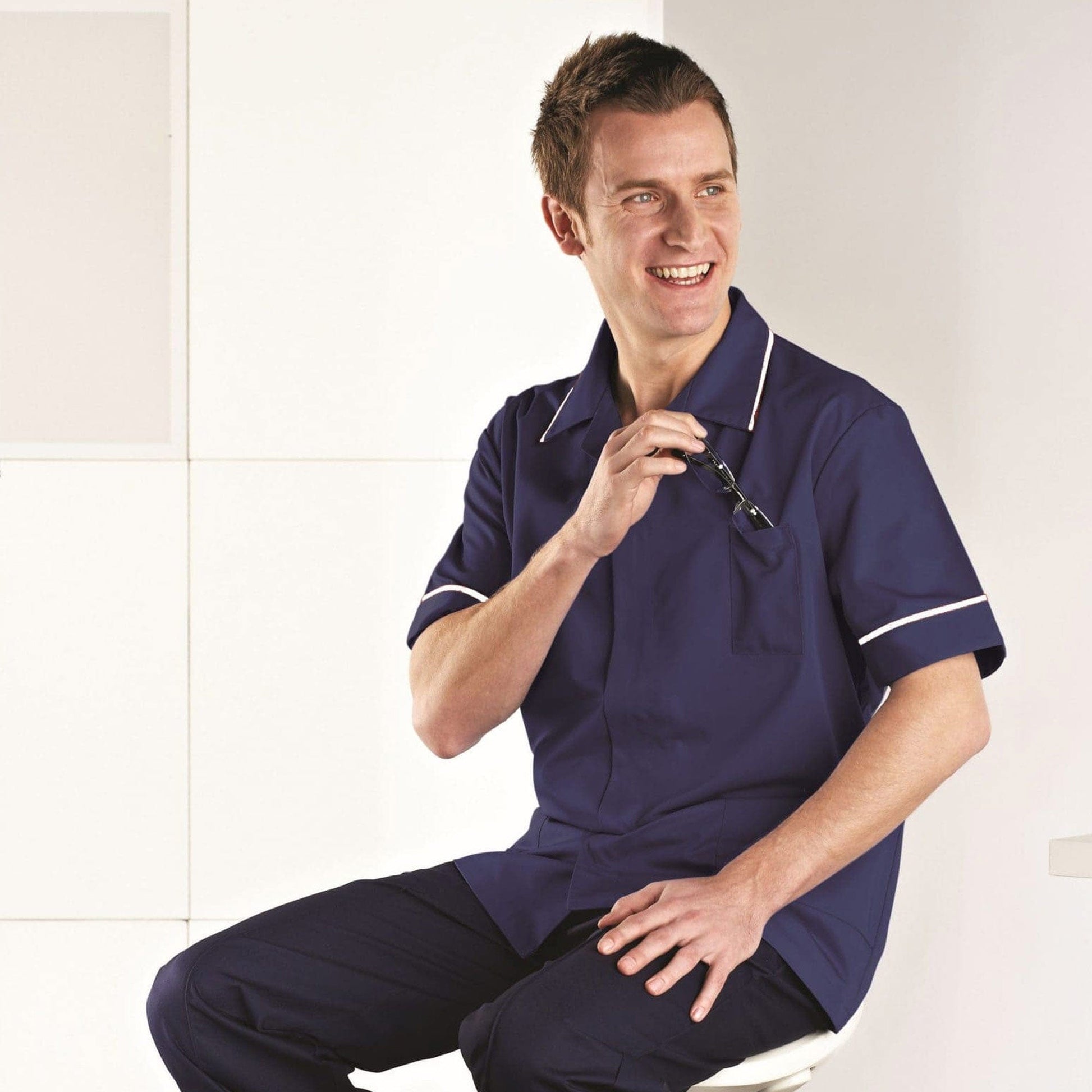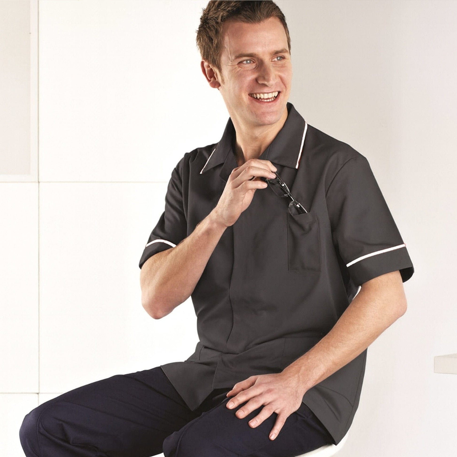 Male healthcare tunic with revere collar and sturdy YKK zip fastening. Vents and pleats provide comfort and unrestricted movement. One top and two lower pockets make this a practical and functional professional healthcare tunic. Available in a choice of colours.