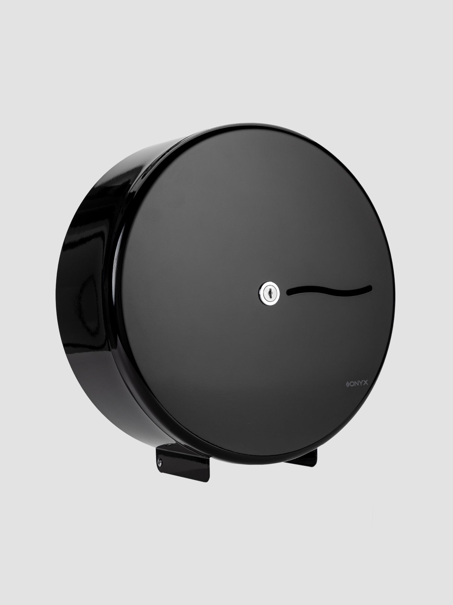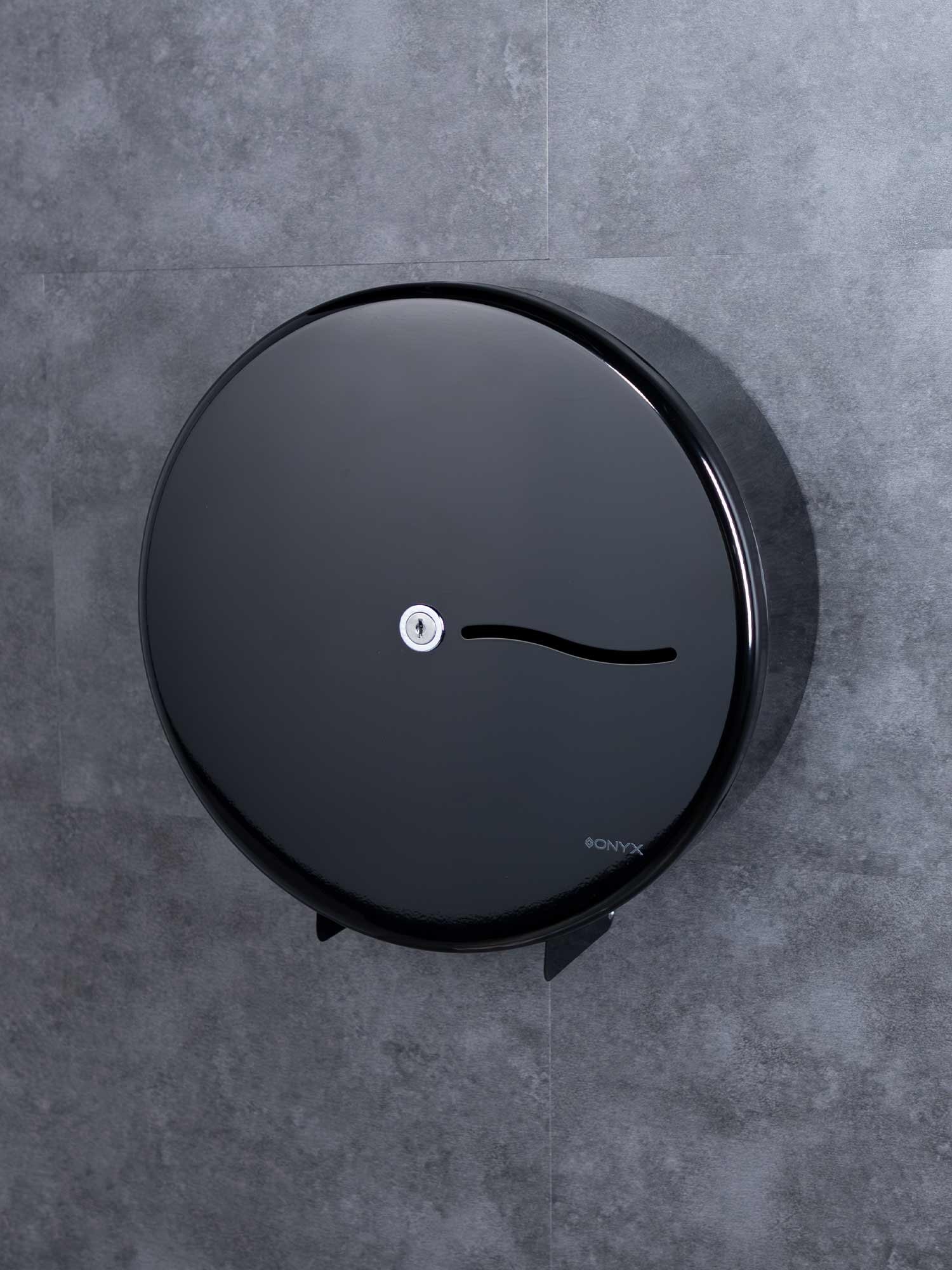 The Onyx 12-inch Jumbo Roll Dispenser offers a superior capacity for holding rolls of toilet paper.