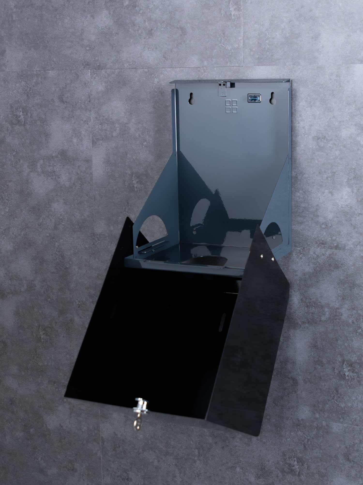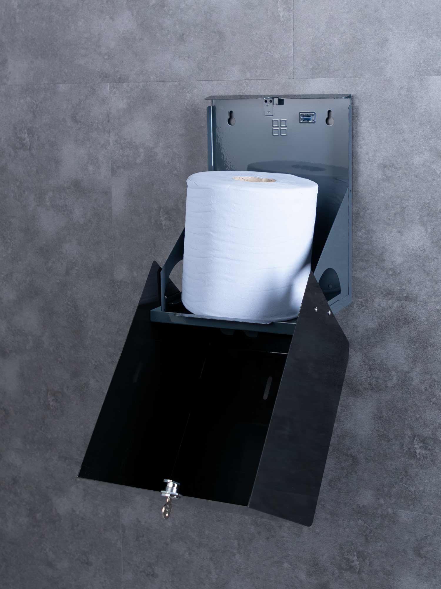 Featuring a sleek, modern design with a black gloss epoxy finish, the dispenser can hold a full size roll of centre feed paper, and dispenses either perforated or non-perforated options.