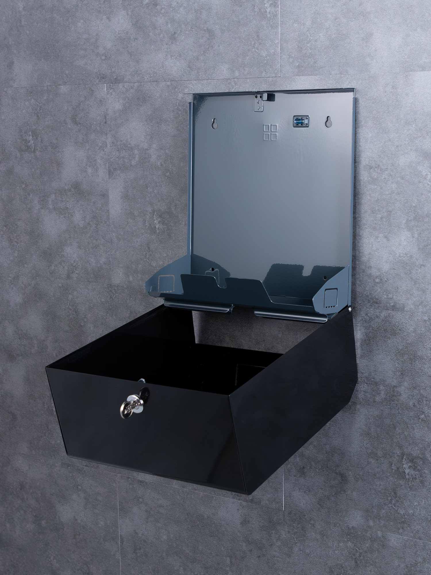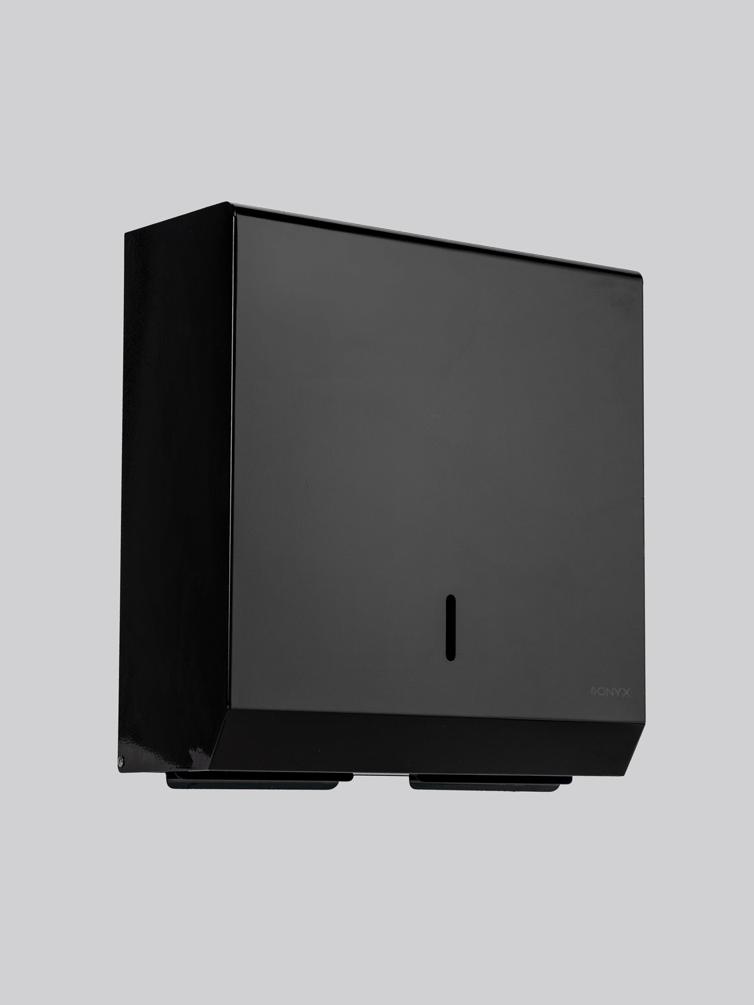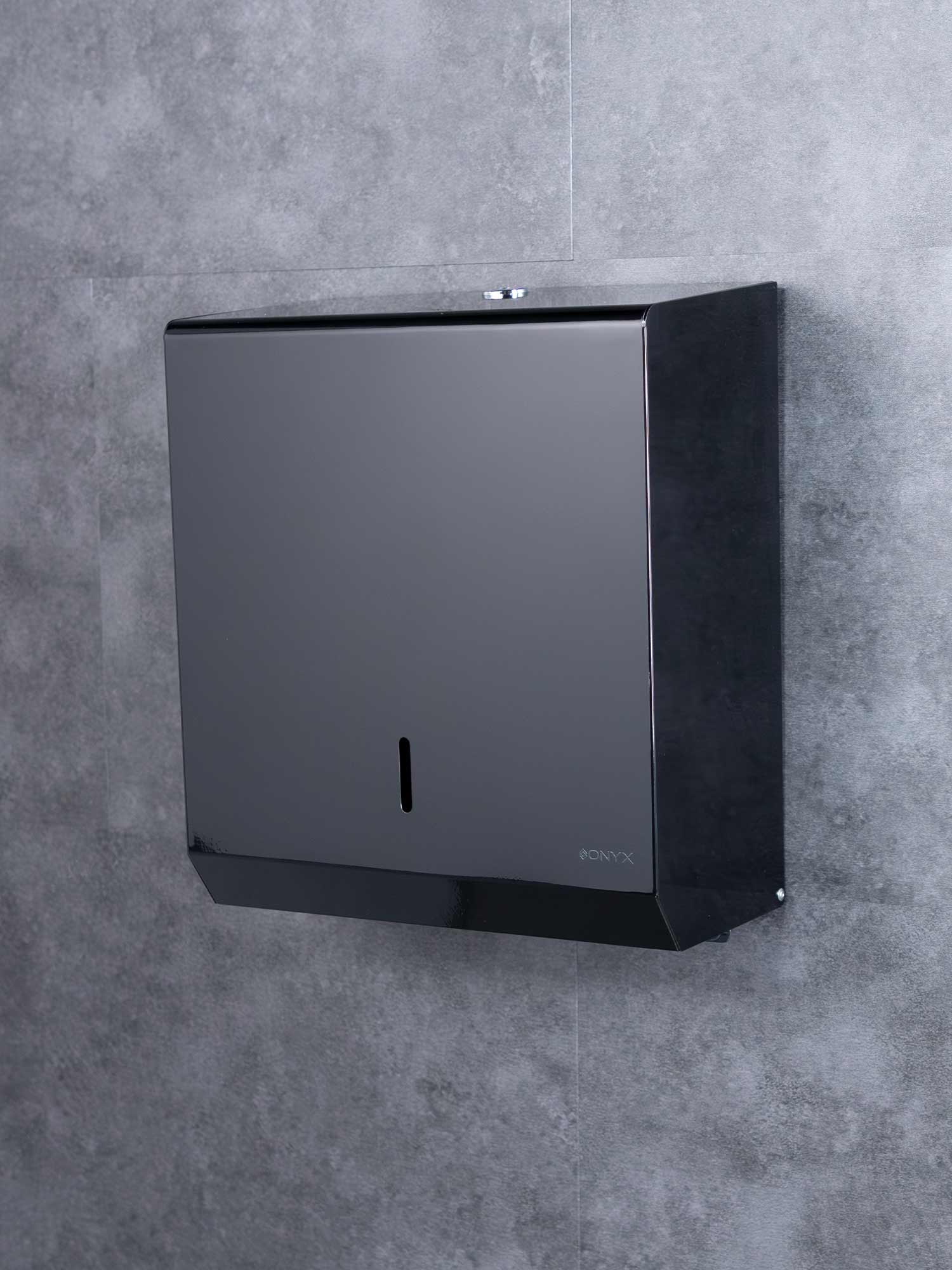 The Onyx Hand Towel Dispenser - an elegant and contemporary dispenser with a glossy epoxy black coat.