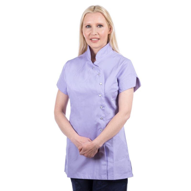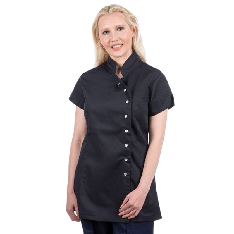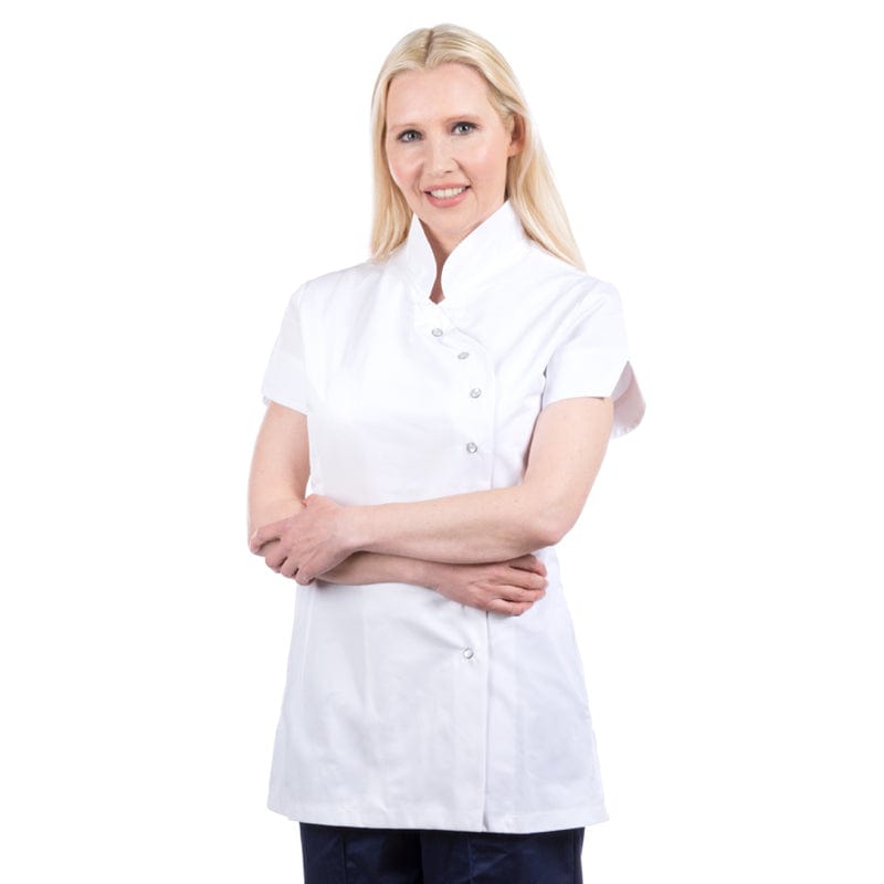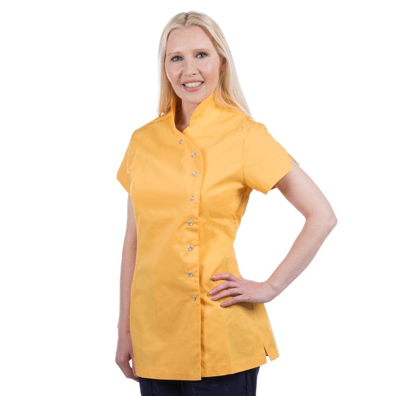 - A Mandarin Collar beauty tunic with Mother of Pearl stud cross fasten