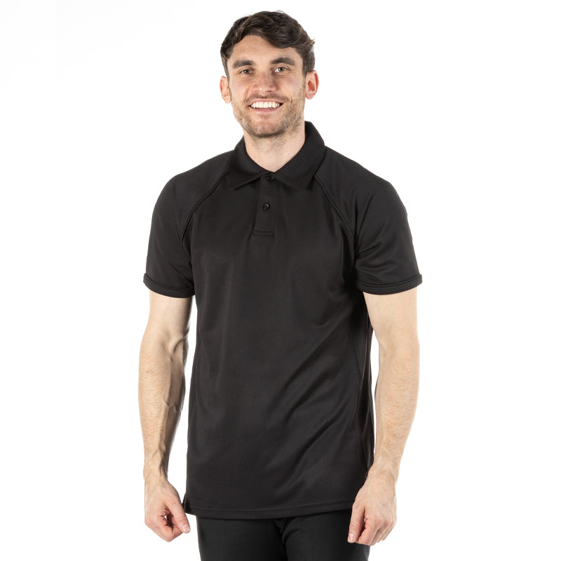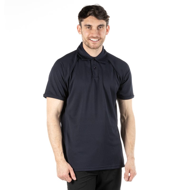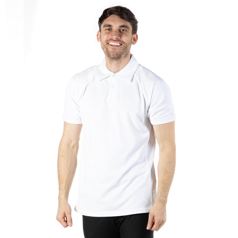 Made using Coolplus® specially modified polyester fibres enable rapid absorption of perspiration from skin surface. Piping along raglan seams and down front and back and with a 2 button placket self fabric collar.