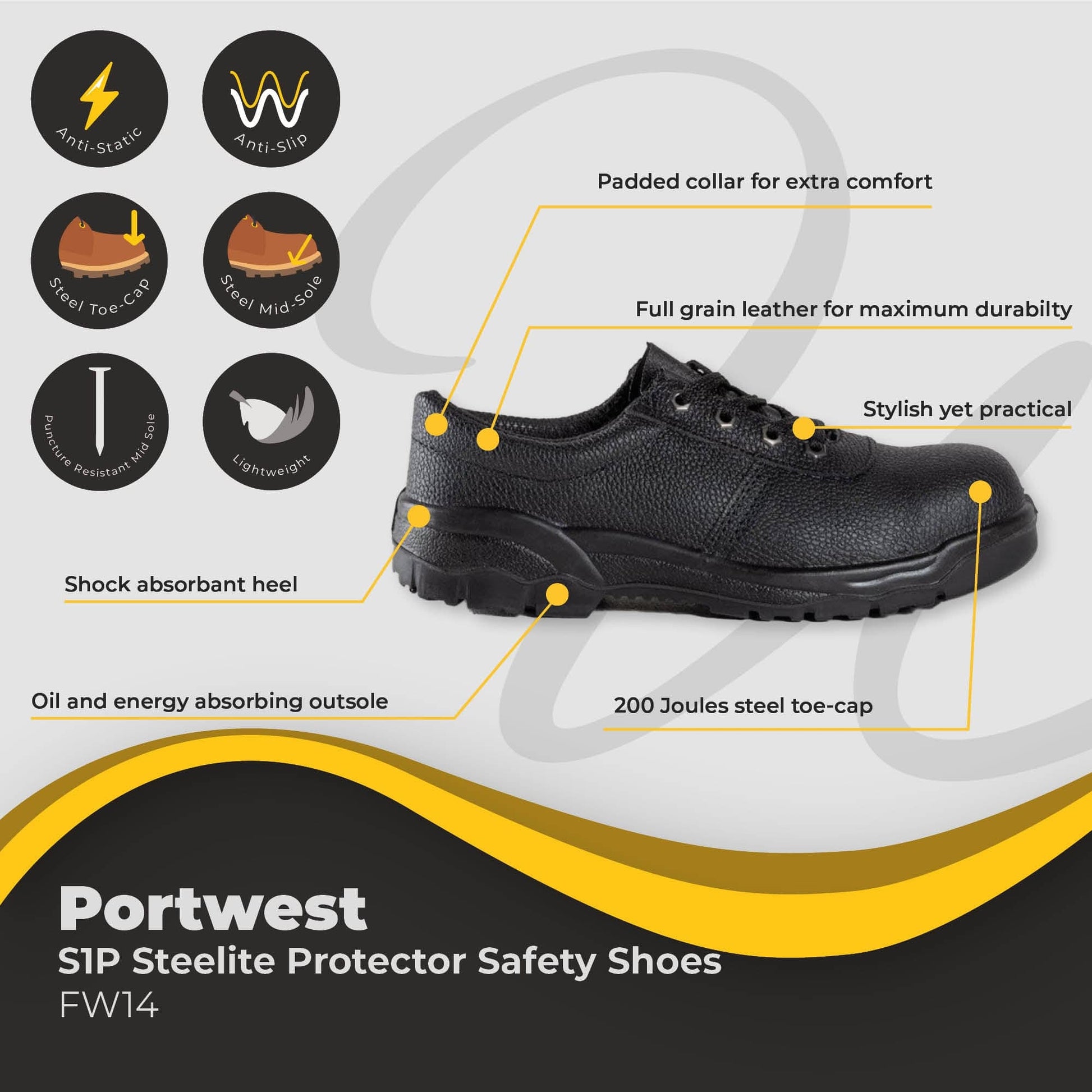 The FW14 - Steelite Protector Shoe is part of the 'Steelite Work' range of safety footwear. This Portwest shoe is fully compliant with all current standards, ideal for industrial wear with a strong and flexible construction.
