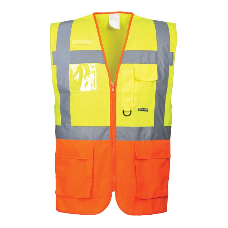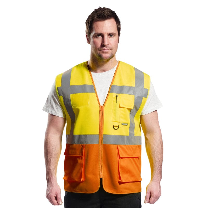 The S376 safety vest has the pockets and features of a jacket when a coat may be too warm. The vest features a clear ID pocket for security passes and cards compliments this unique garment. With many companies and their operatives now using combinations of high visibility orange and yellow fabrics together, these contrasting styles are in increasing demand for many customers.