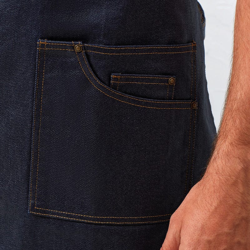 The bib boast several jean like accents to complement a smart yet casual look. The oversized patch pocket has ample space for a tablet device, with classic stitched pocket detail to add to the look.