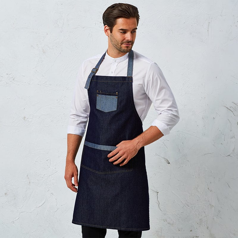 The Premier Vintage Jean Stitch Denim bib is a durable and fashionable apron for workers on the move.