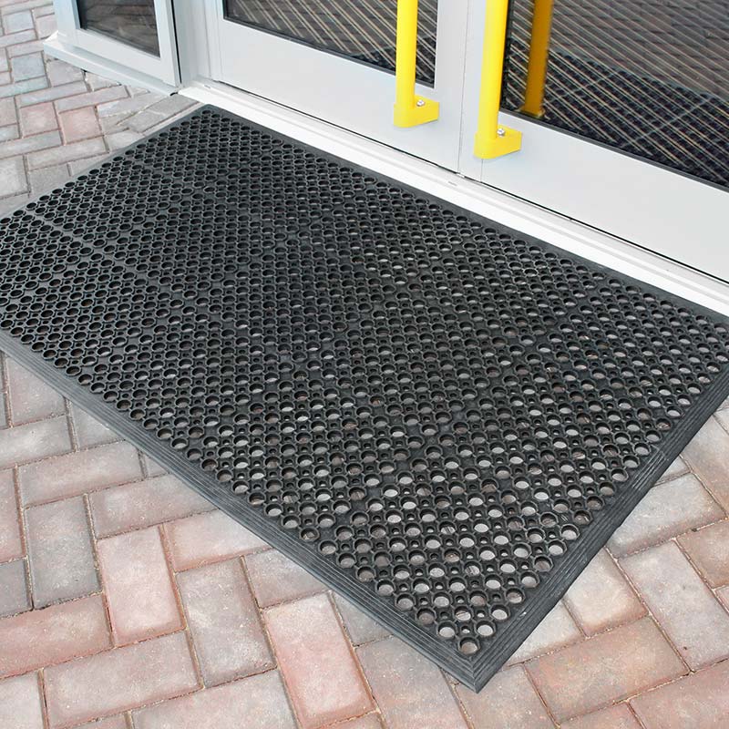 Durable Rubber raised circular top surface gives a good non-slip tread and effective scraping action. Can also be used within the workplace for an anti-fatigue and slip resistant mat.