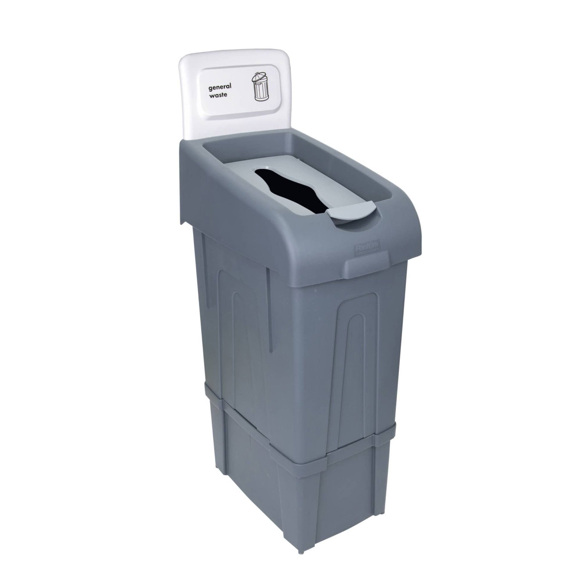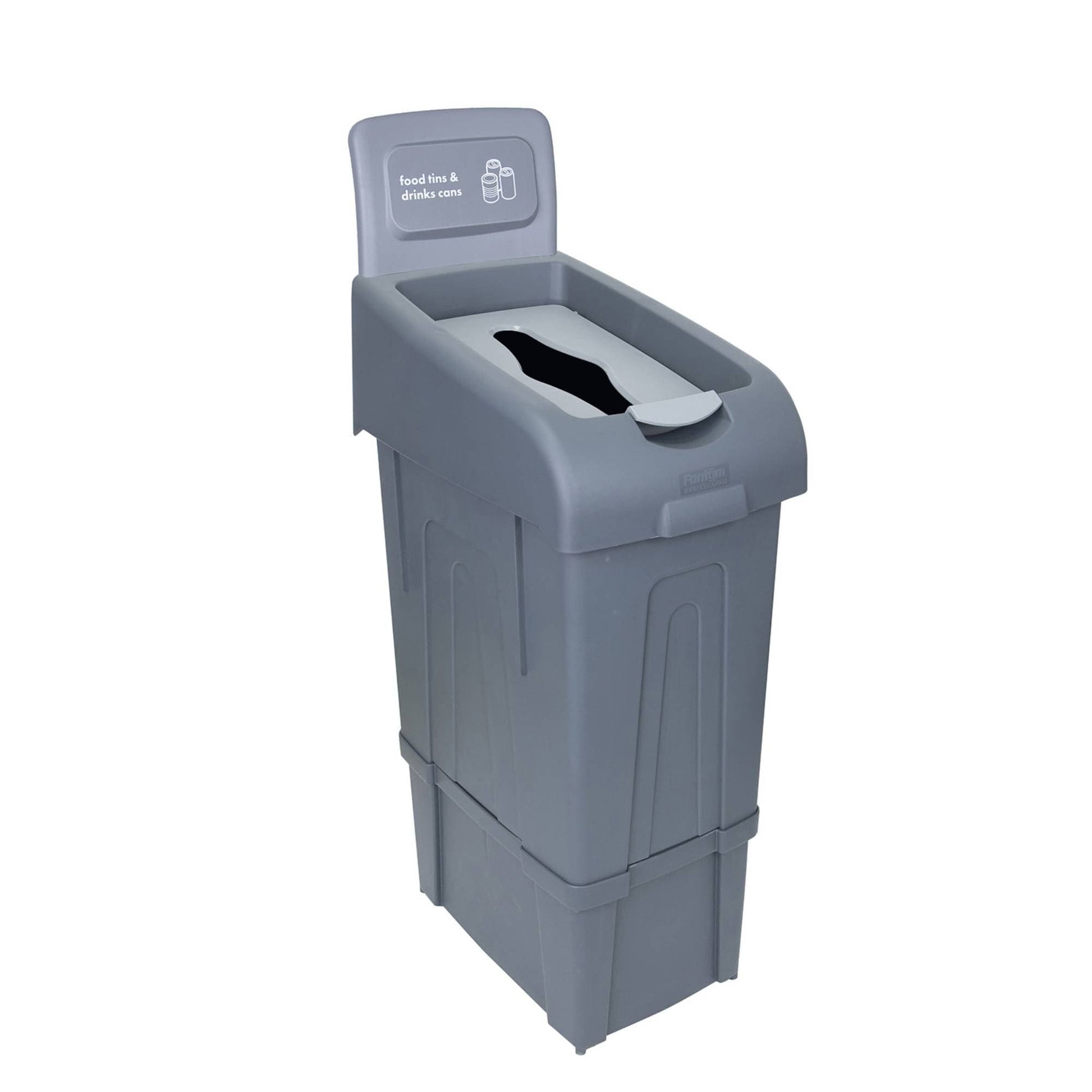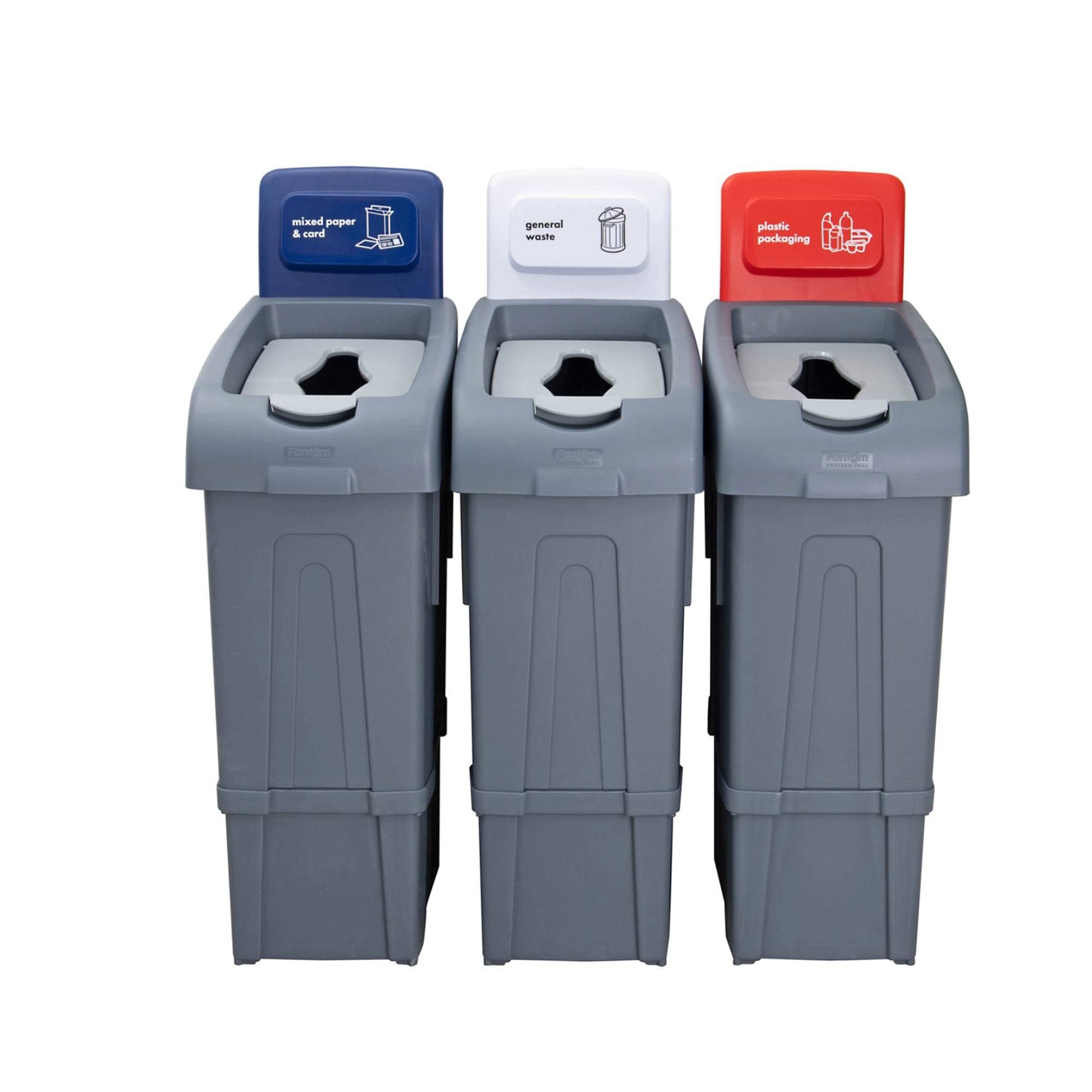Constructed from durable and robust polypropylene, the bins are available with colour-coded back panels for glass bottles & jars, food tins & drinks cans, mixed paper and card, food waste, plastic packaging, general waste, and mixed recycling.