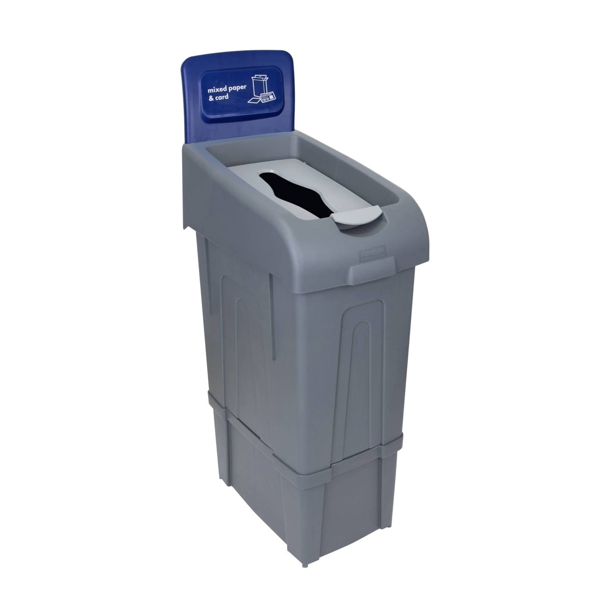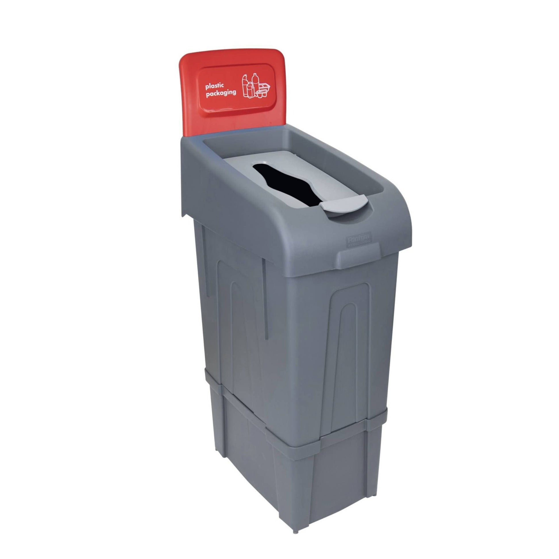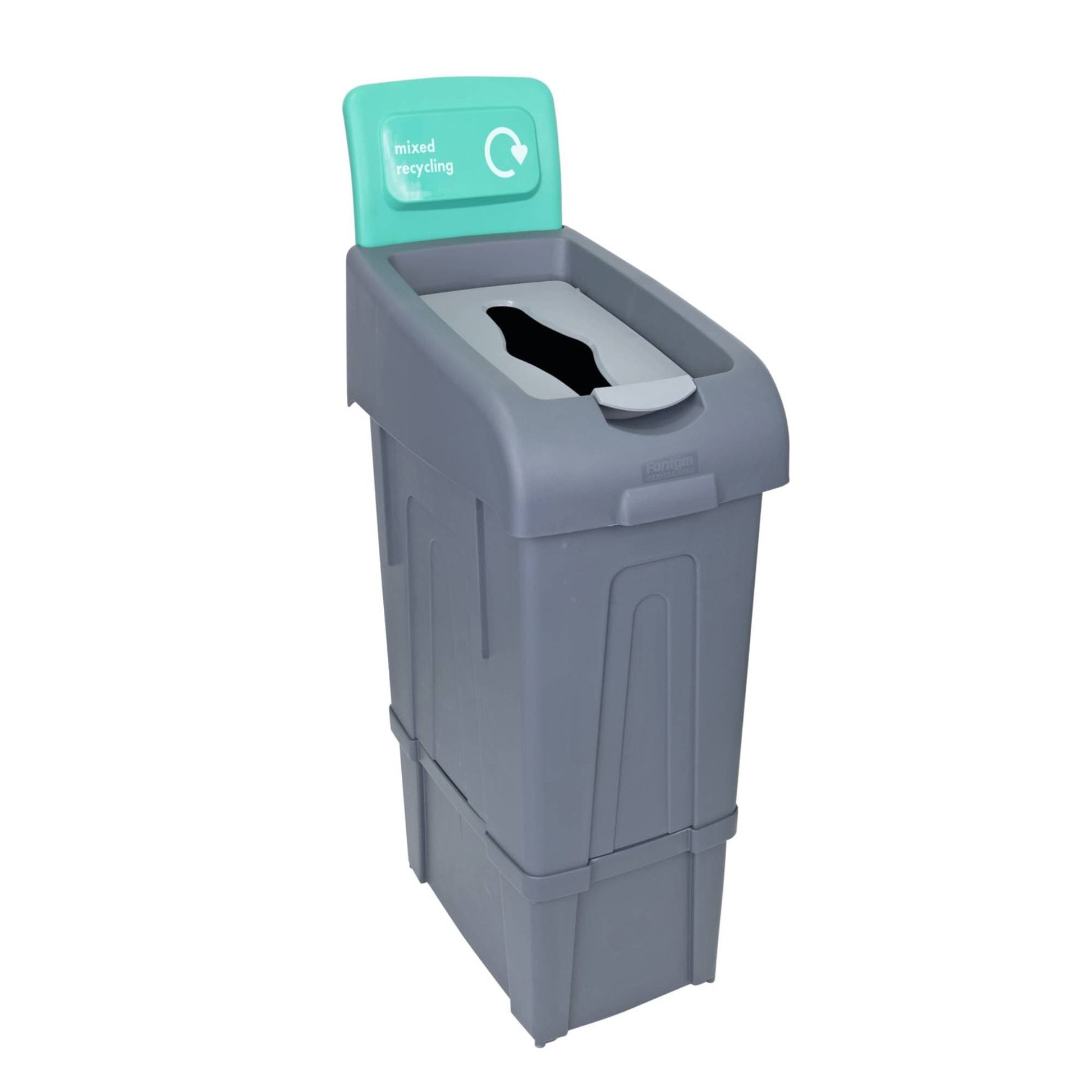 Constructed from durable and robust polypropylene, the bins are available with colour-coded back panels for glass bottles & jars, food tins & drinks cans, mixed paper and card, food waste, plastic packaging, general waste, and mixed recycling.