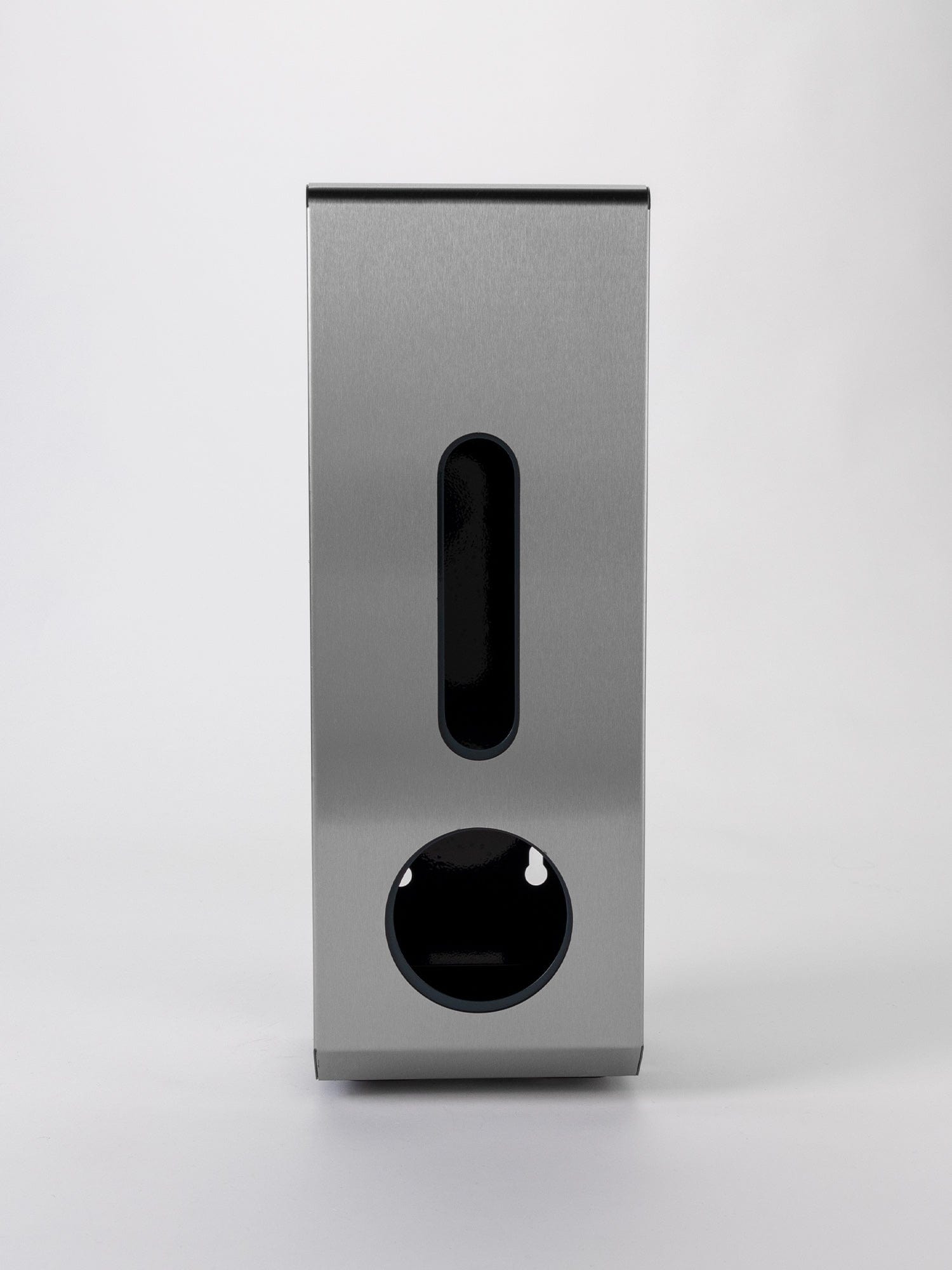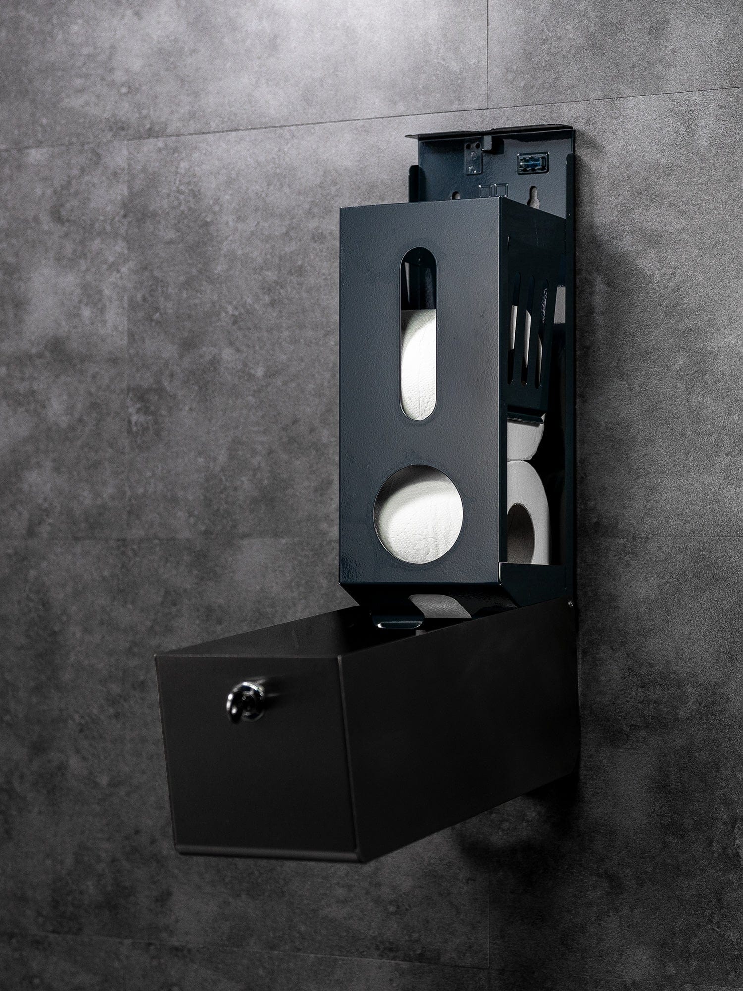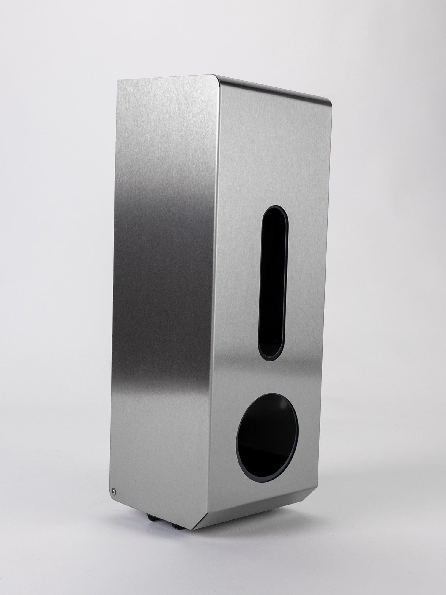 A lockable, sturdy, durable stainless steel dispenser enabling storage of up to three standard toilet rolls.