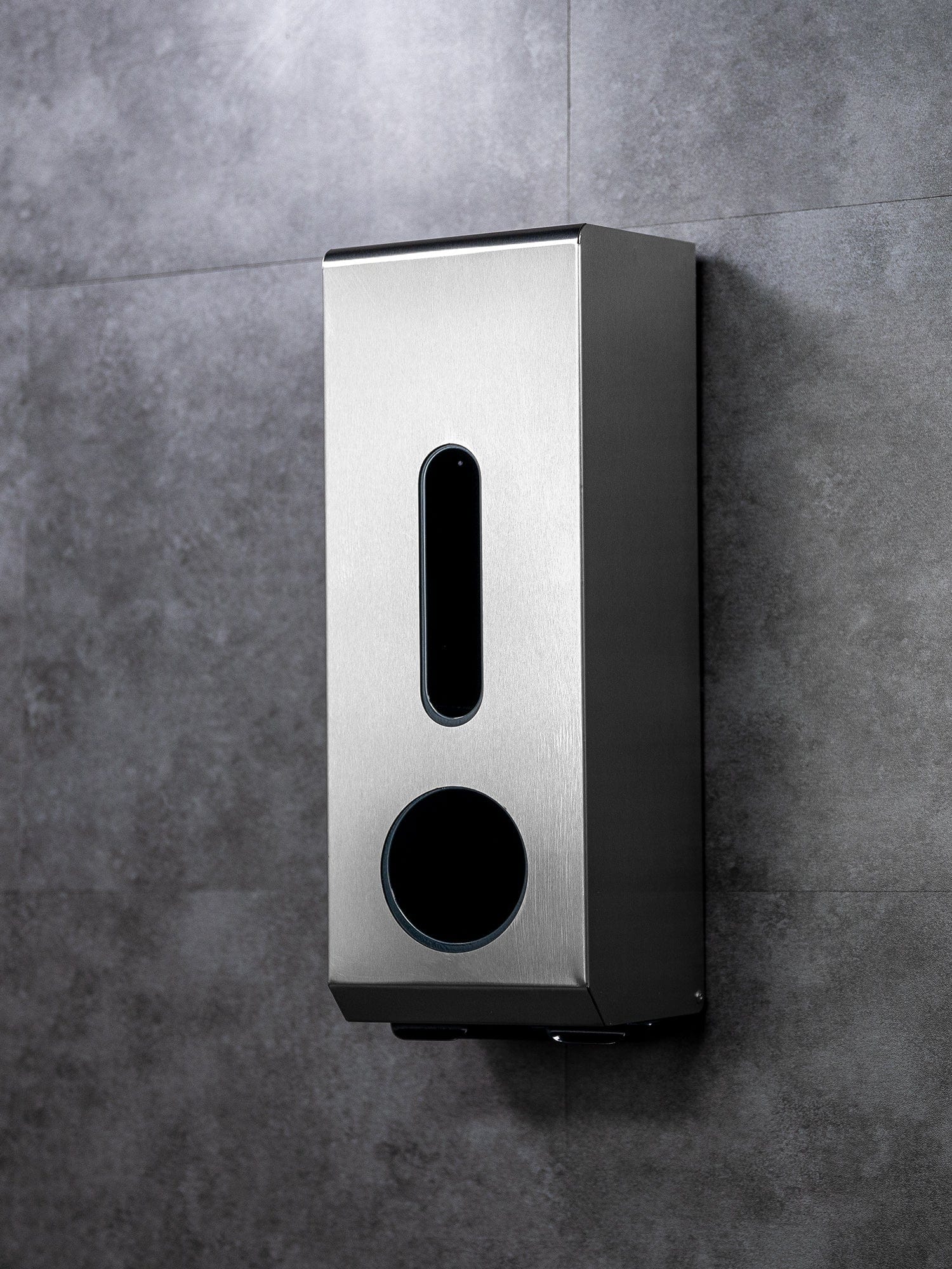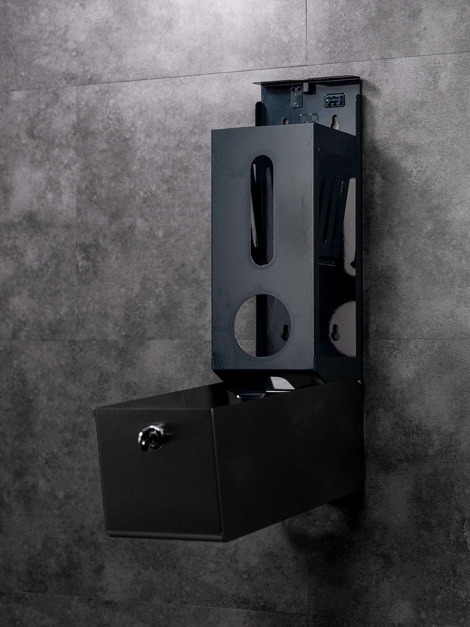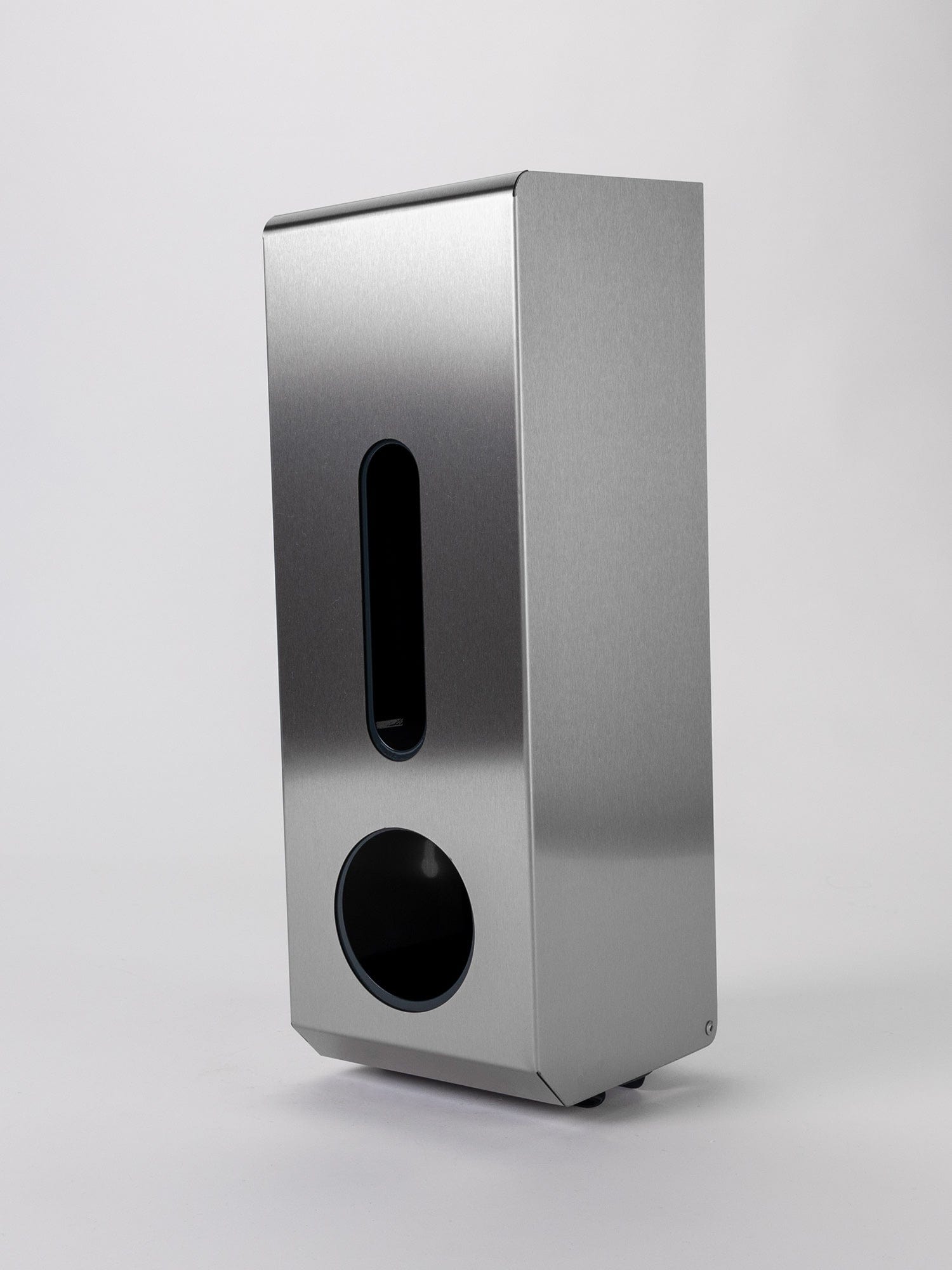 A lockable, sturdy, durable stainless steel dispenser enabling storage of up to three standard toilet rolls.