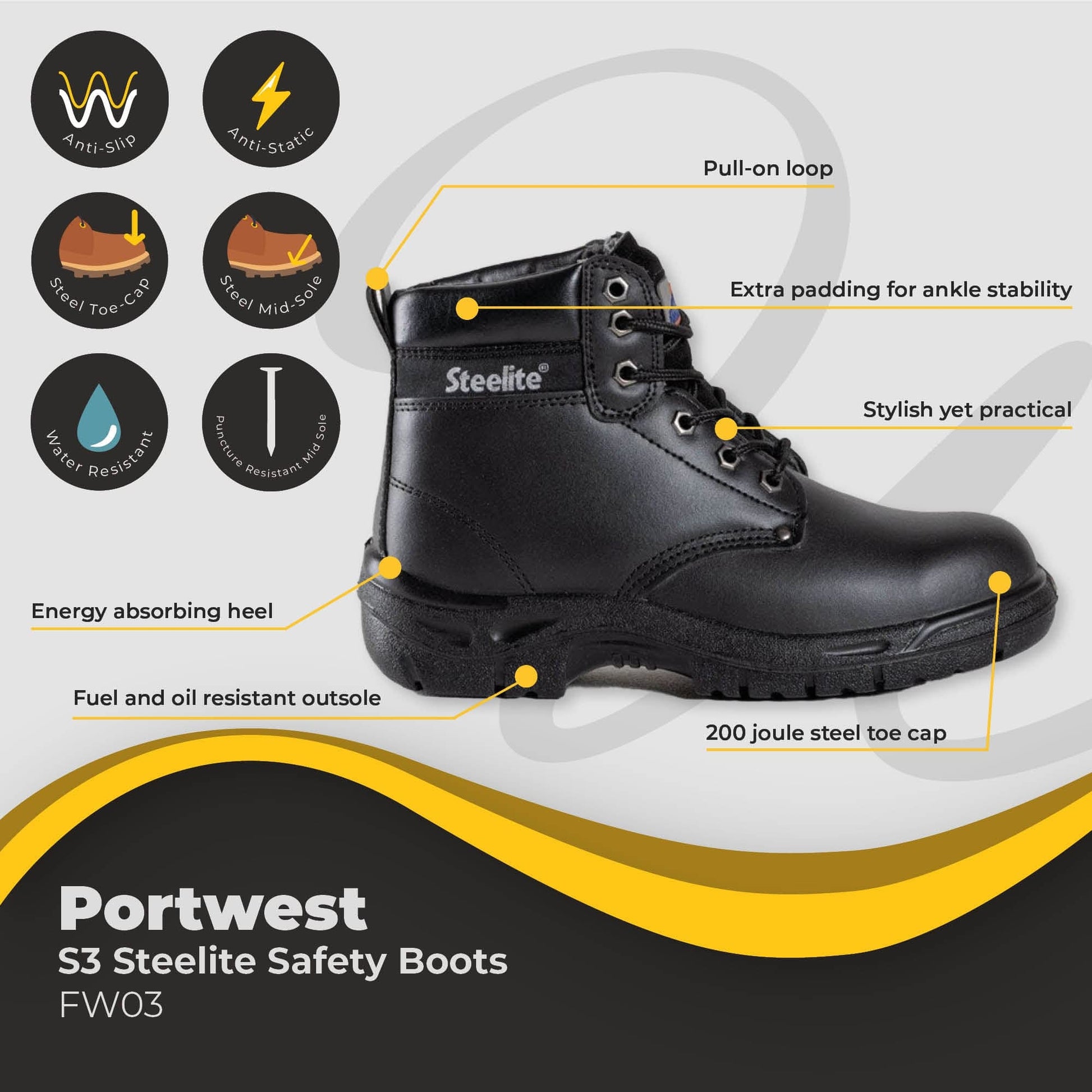 The FW03 - Steelite Boot is part of the 'Steelite Work' range of safety footwear. This Portwest boot is fully compliant with all current standards, ideal for industrial wear with a strong and flexible construction.