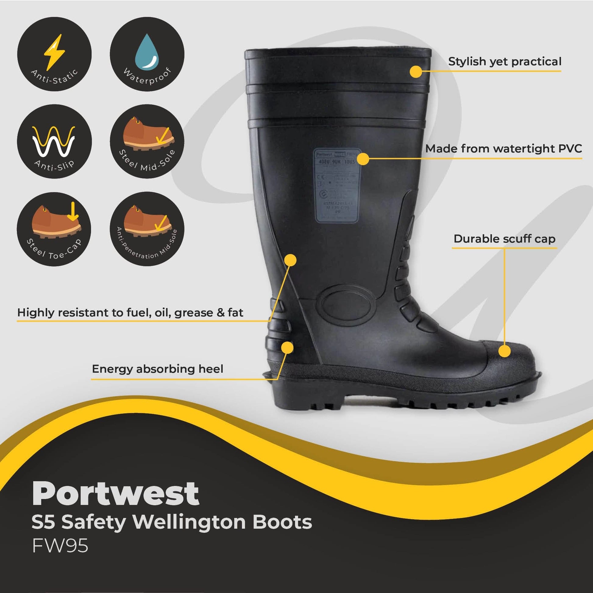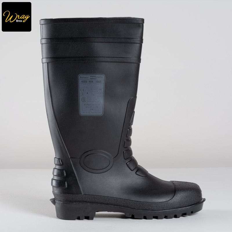 The FW95 Black Safety Wellington is part of the 'Portwest Work' range of safety footwear. This is a complete range of styles made of polymeric materials. Made to be durable and with a waterproof construction that is highly resistant to fuels, oils, grease and fats.