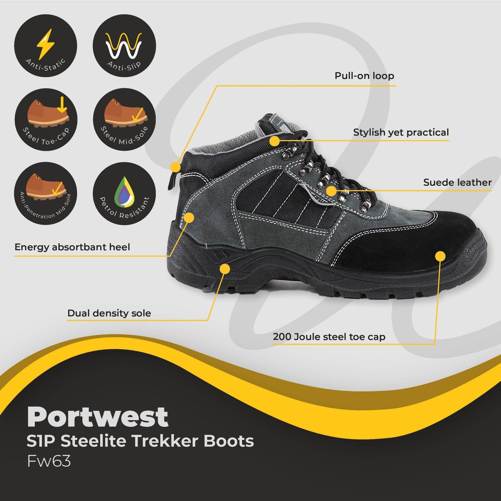 Portwest is renowned for producing high-quality workwear and safety footwear. The Steelite Trekker Boot S1P FW63 continues this tradition, offering unbeatable protection, comfort, and durability. Whether you're dealing with hazardous materials or working on slippery surfaces, these boots will keep your feet safe and comfortable. With a blend of modern design and industrial-strength protection, they are the ideal choice for workers who demand both style and safety.