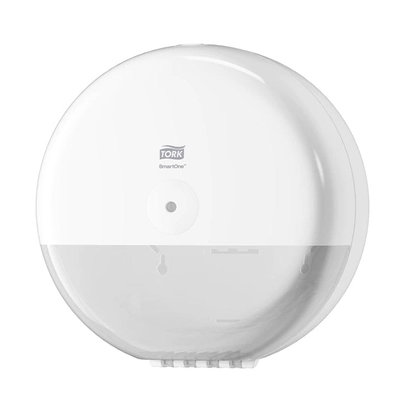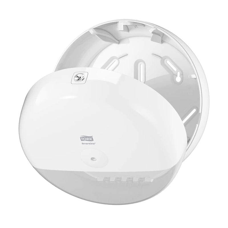 The white Tork SmartOne Toilet Roll Dispenser in Elevation Design is a modern efficient dispensing system.