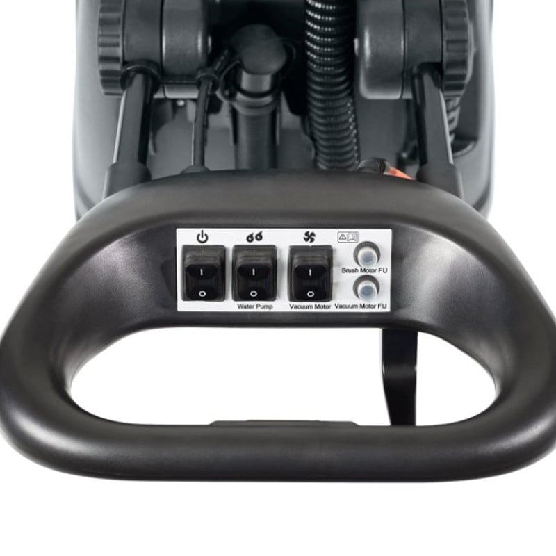 The commercial carpet cleaning machine is equipped with large capacity tanks; 35L solution and 23L recovery made of ridged, chemical resistant and environmentally friendly polyethylene. The handle can easily be adjusted for different operator heights to obtain an ergonomic working position.