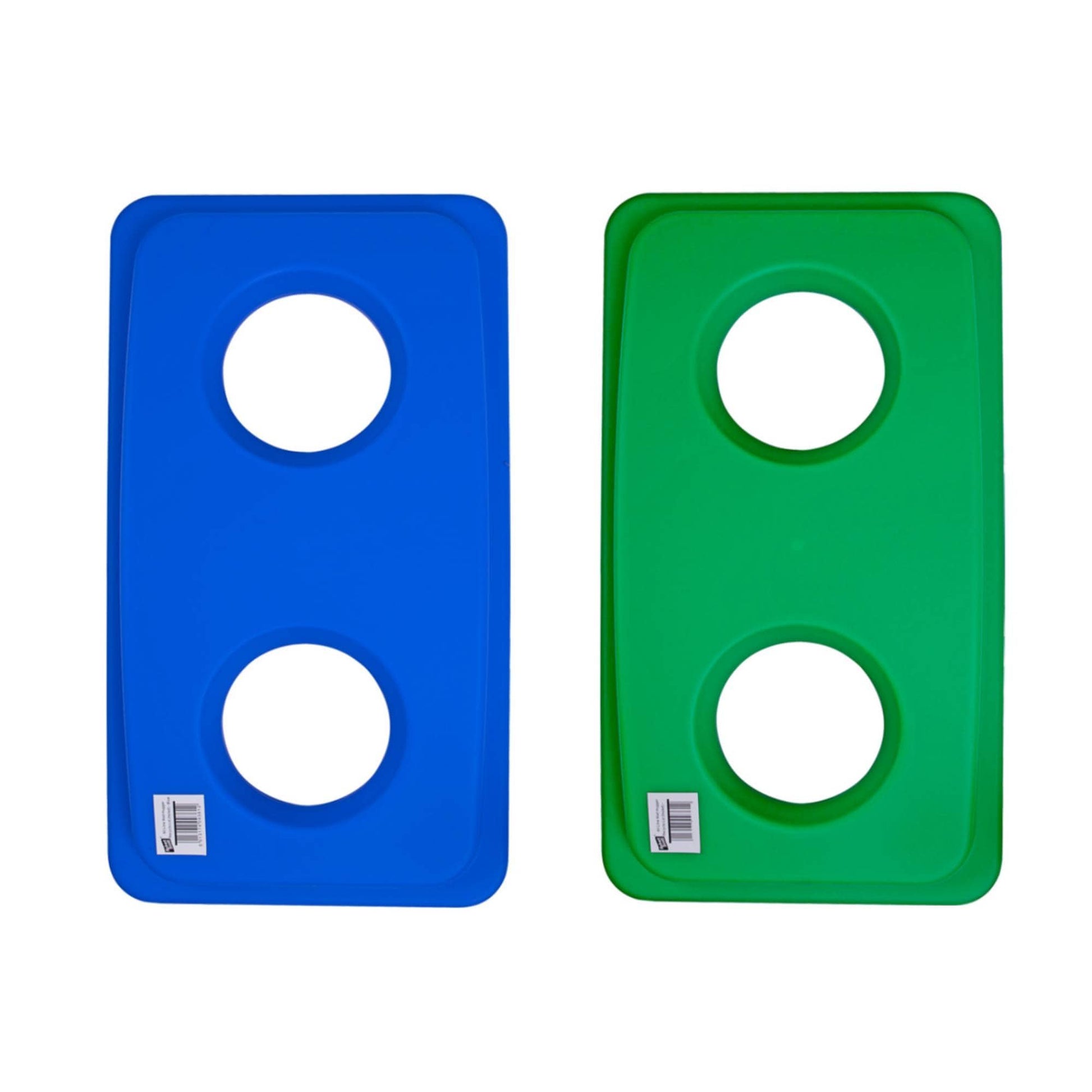 Professional-grade dual-opening recycling bin lid by Robert Scott & Sons. Features two circular holes for efficient waste separation and recycling compliance. Available in blue or green to match standard recycling colour coding. Compatible with Wall Hugger containers. Made from durable, easy-clean plastic for long-lasting commercial use.