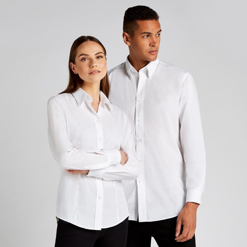 This long sleeve option adds sophistication and added warmth if needed. The polycotton poplin has a fine weave and smooth texture for a professional appearance.